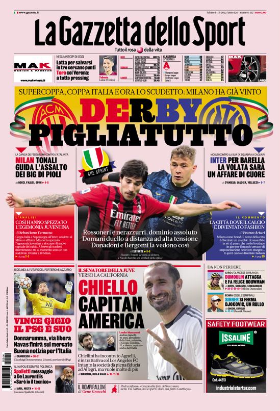 Le prime pagine dei quotidiani sportivi italiani di oggi 14 maggio 2022. La rassegna stampa delle notizie sui rossoneri