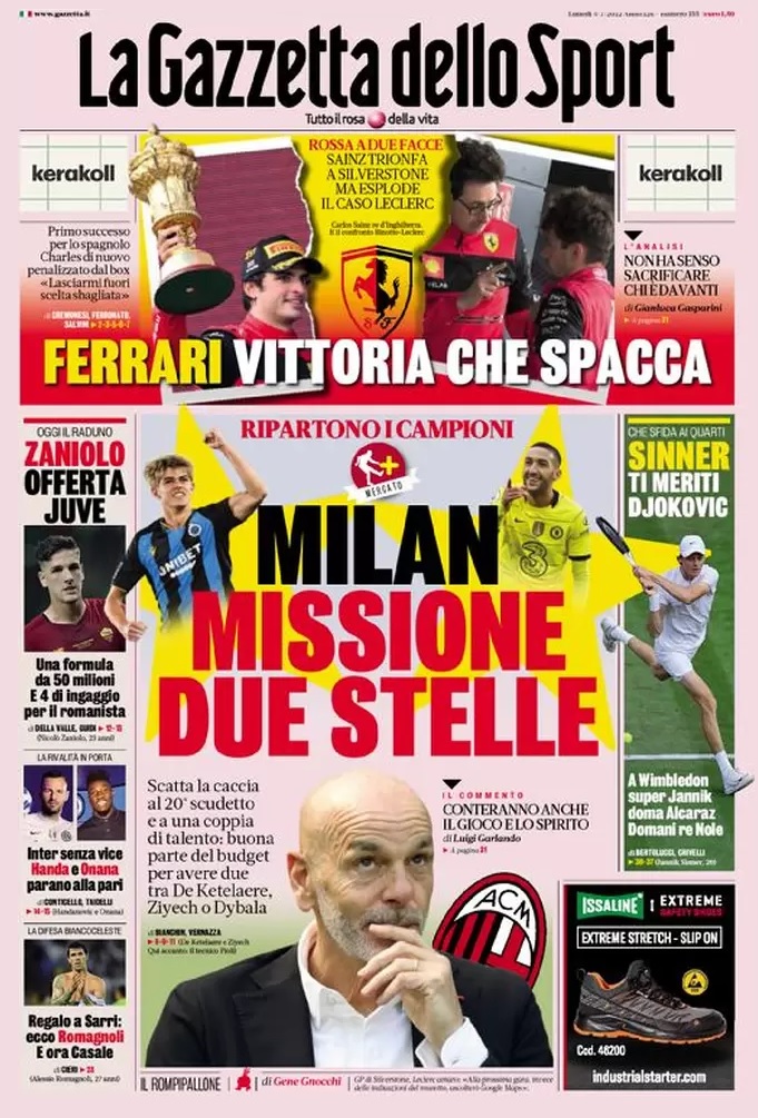 Le prime pagine dei quotidiani sportivi italiani di oggi 4 luglio 2022. La rassegna stampa delle notizie sui rossoneri di PioliGazzetta dello SportTuttosportCorriere dello Sport