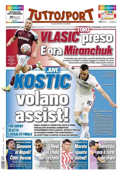 Le prime pagine dei quotidiani sportivi italiani di oggi 10 agosto 2022. La rassegna stampa delle notizie sui rossoneri di PioliGazzetta dello SportCorriere dello SportTuttosport