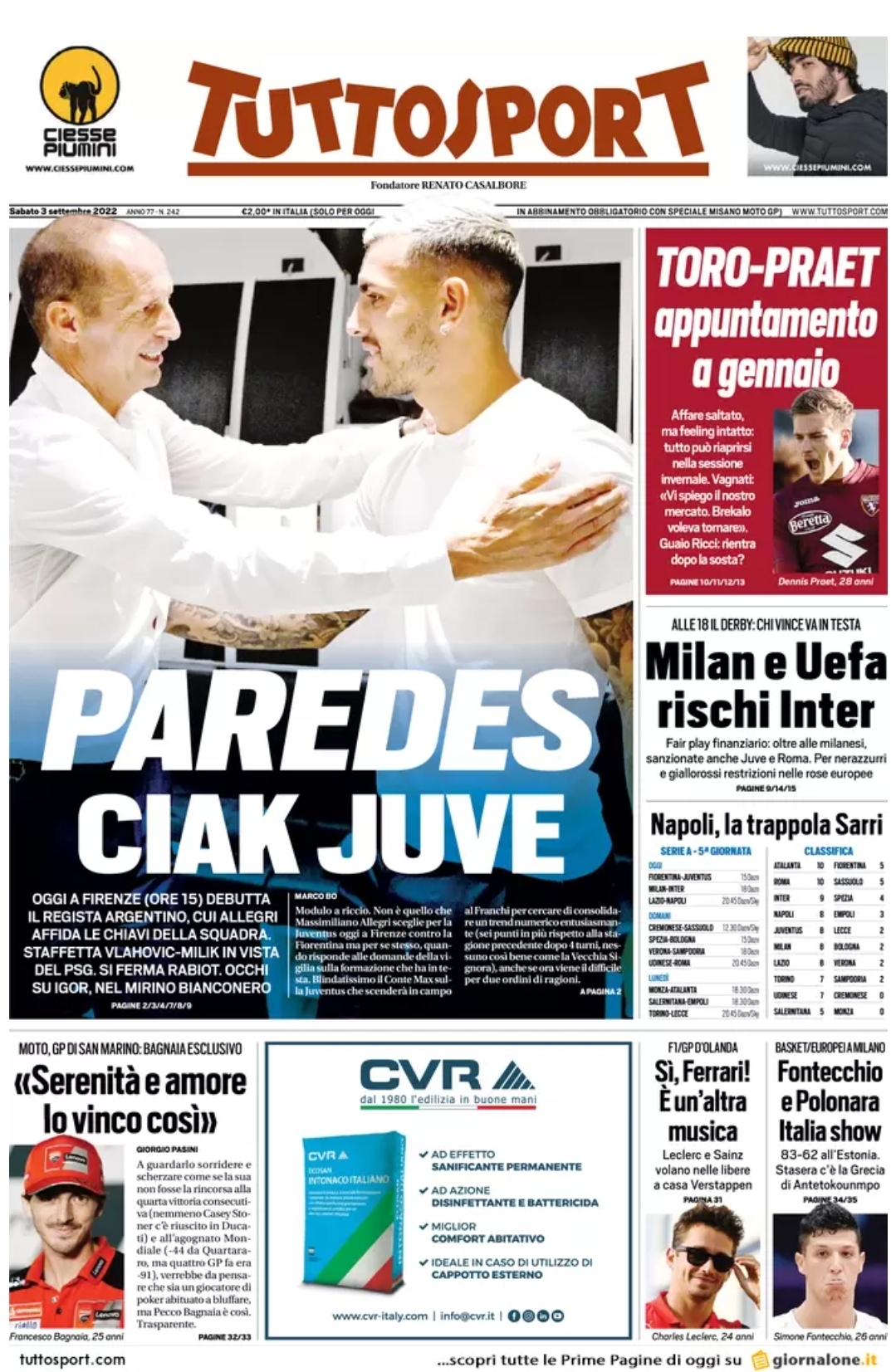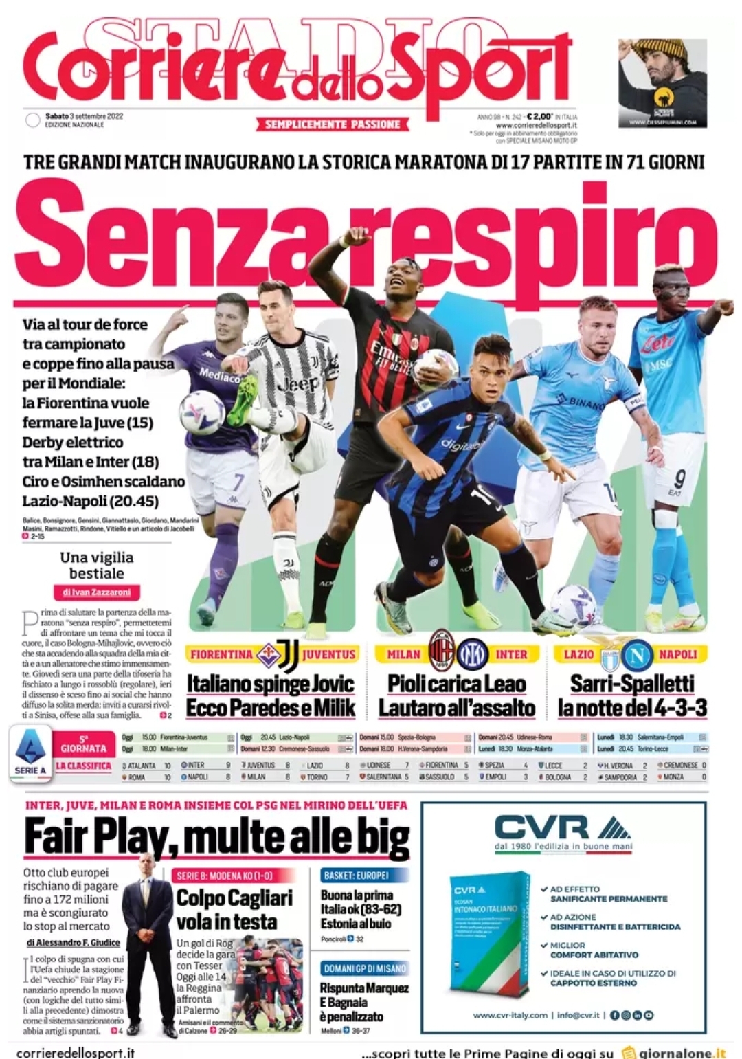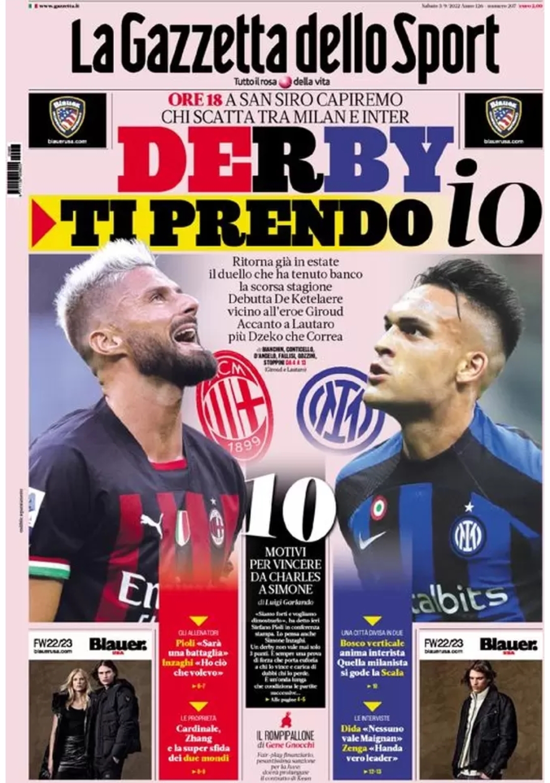 Le prime pagine dei quotidiani sportivi italiani di oggi 3 settembre 2022. La rassegna stampa delle notizie sui rossoneri di Pioli