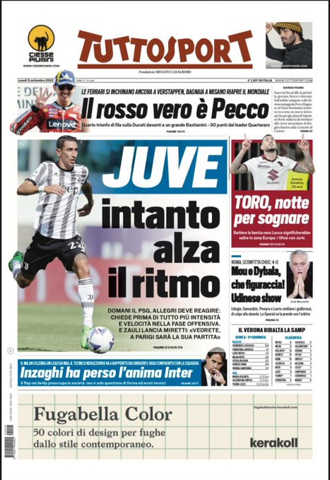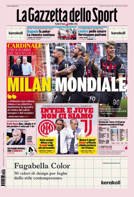 Le prime pagine dei quotidiani sportivi italiani di oggi 5 settembre 2022. La rassegna stampa delle notizie sui rossoneri di PioliGazzetta dello SportCorriere dello SportTuttosport