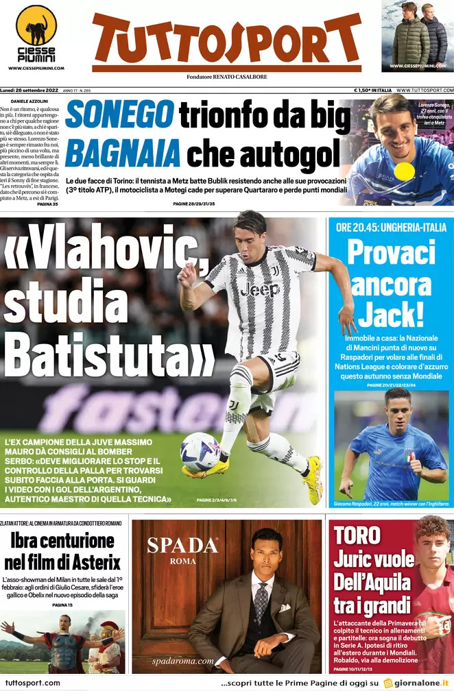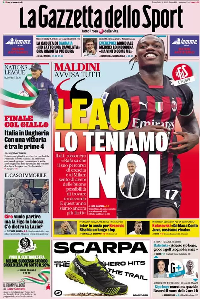 Le prime pagine dei quotidiani sportivi italiani di oggi 26 settembre 2022. La rassegna stampa delle notizie sui rossoneri di PioliGazzetta dello SportCorriere dello SportTuttosport