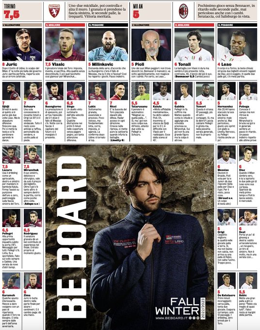 Theo Hernandez, Pobega, Origi, De Ketelaere e Pioli ricevono un’insufficienza piena con il tecnico rossonero che secondo la rosea mette in campo “uno dei suoi Milan peggiori”. Si salvano parzialmente Tatarusanu, Tomori, e Rebic (5,5) mentre raggiungono la sufficienza i soli Tonali, Gabbia, Messias, Dest e Diaz.
