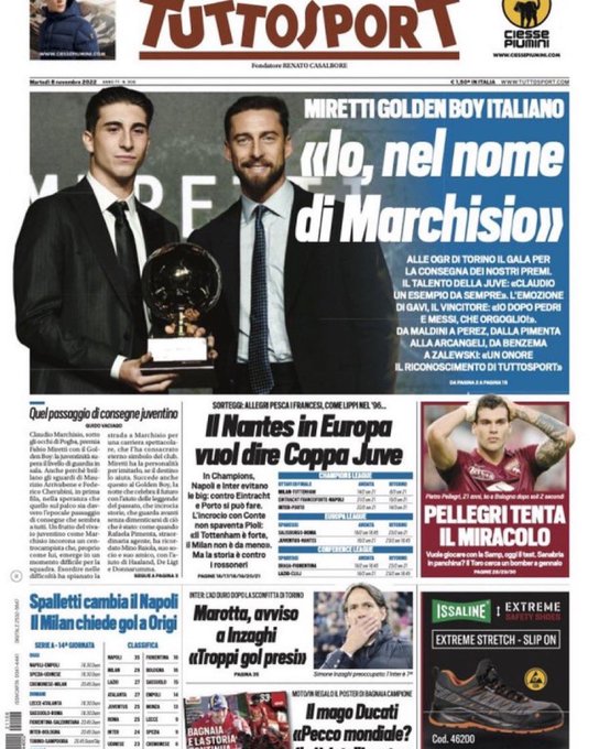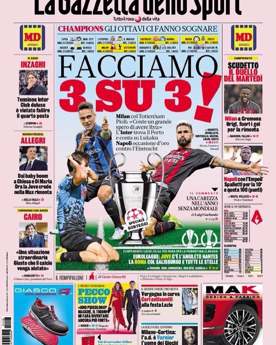 Le prime pagine dei quotidiani sportivi italiani di oggi 8 novembre 2022. La rassegna stampa delle notizie sui rossoneri di Pioli