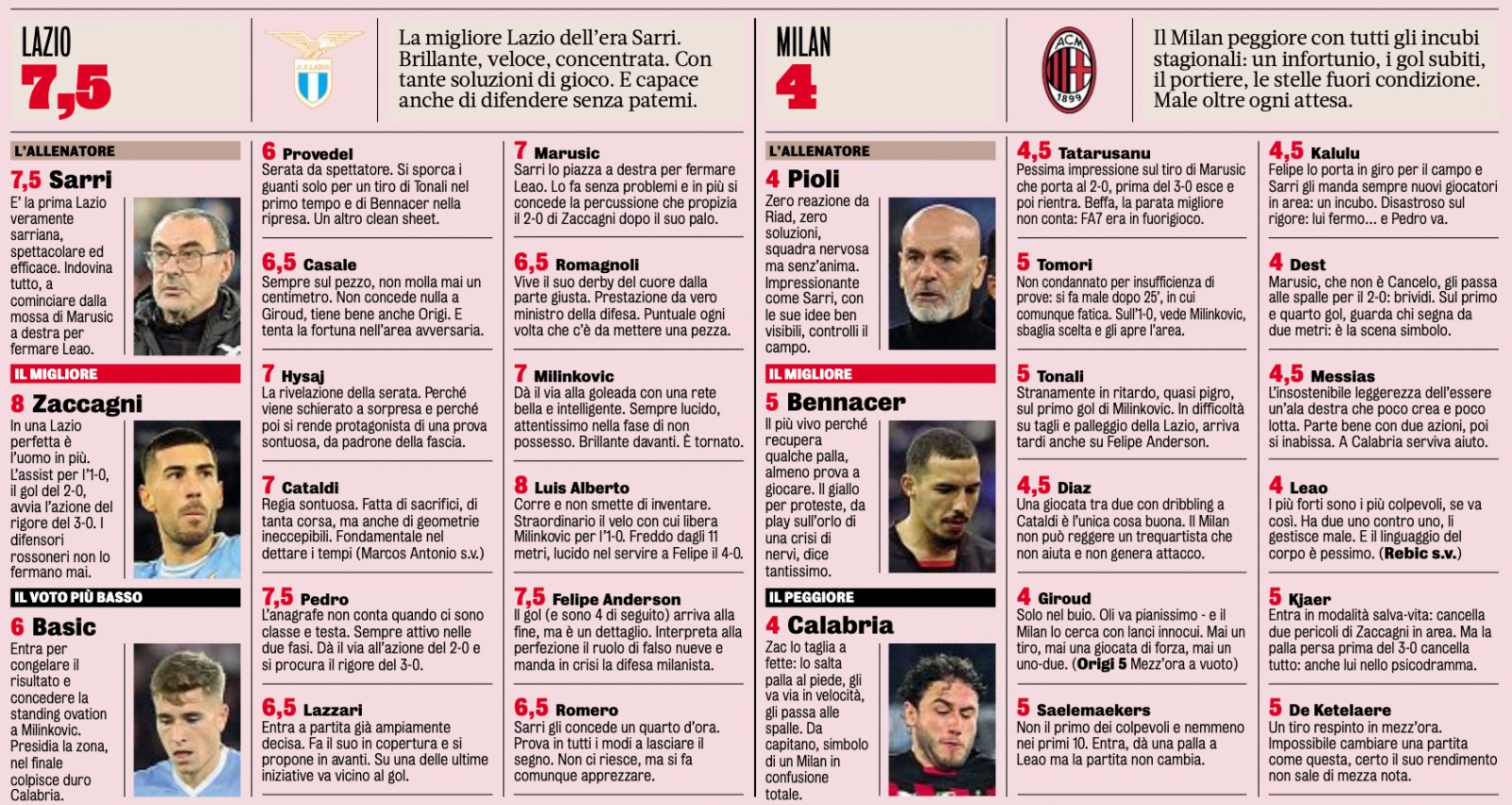 La pessima prestazione del Milan ieri sera all’Olimpico contro la Lazio ha ovviamente portato a voti pessimi nelle pagelle stilate da La Gazzetta dello Sport questa mattina. La squadra rossonera prende complessivamente 4 (stesso voto contro l’Inter in Supercoppa) e nello specifico sono Pioli, Calabria (il peggiore in campo per la rosea) Giroud, Leao e Dest a condividere la più grave insufficienza.