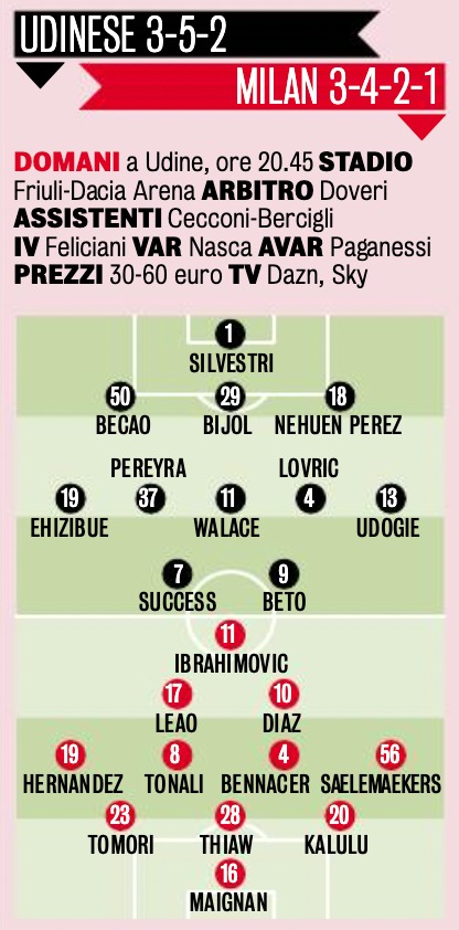 In avanti la defezione più pesante: Olivier Giroud squalificato sarà sostituito, secondo quanto emerge da Milanello, da Zlatan Ibrahimovic . Alle spalle del centravanti svedese si aggireranno Rafael Leao e Brahim Diaz.