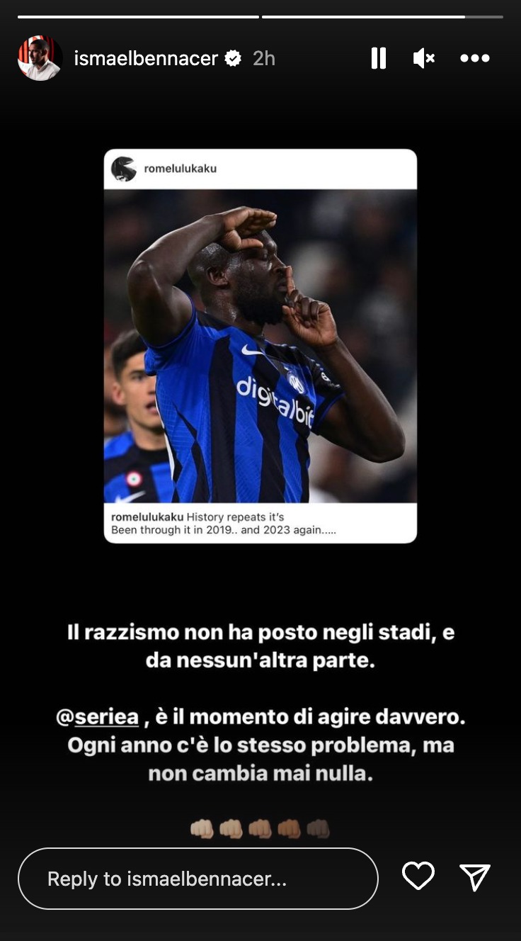 A esprimersi pubblicamente sull’accaduto è stato oggi Ismael Bennacer, attraverso una stories su Instagram. Queste le parole del centrocampista rossonero: “Il razzismo non ha posto negli stadi, e da nessun’altra parte. Serie A, è il momento di agire davvero. Ogni anno c’è lo stesso problema, ma non cambia mai nulla”.