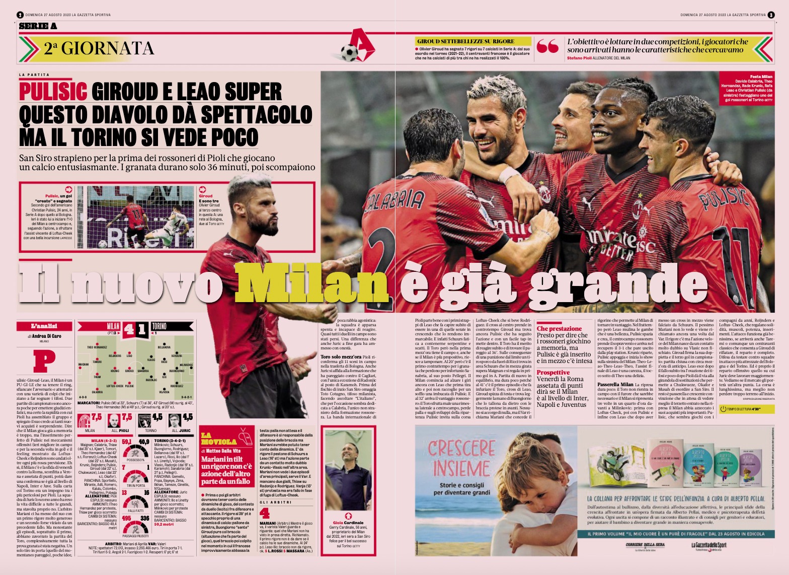 L’edizione odierna della Gazzetta dello Sport si è focalizzata sulla vittoria del Milan ottenuta ieri contro il Torino. In particolare una lente di ingrandimento è stata posta sul tridente ‘PU-GI-LE’, composto da Pulisic, Giroud e Leao, che ha convinto per la seconda partita consecutiva in campionato.