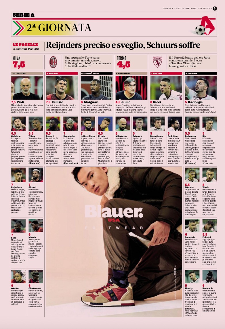 L’edizione di questa mattina de La Gazzetta dello Sport ha riportato le pagelle della partita di ieri sera, a partire dalla prestazione complessiva del Milan, che ha ottenuto un 7,5 così come mister Pioli.