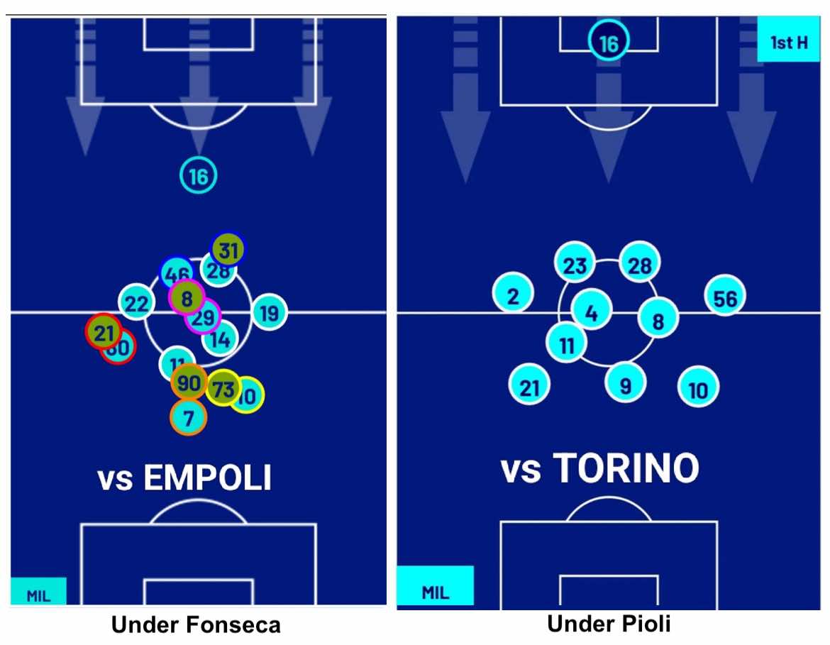 Partiamo dall’era Pioli al Milan. Sotto il precedente allenatore la squadra si allungava nettamente di più andando così a generare enormi spazi non coperti tra i vari reparti. Un problema che i rossoneri hanno avuto anche all’inizio di questa stagione, come evidenziato nel primo match di campionato disputato contro il Torino.